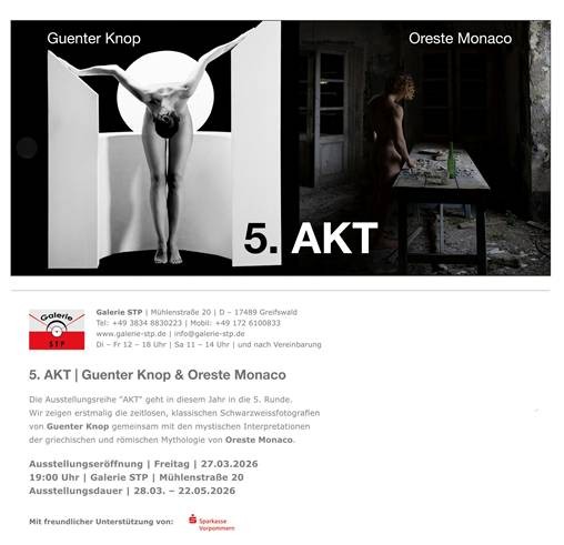 Die Ausstellung »AKT« geht in diesem jahr in die 5. Runde. Wir zeigen erstmalig die zeitlosen, klassischen Schwarzweißfotografien von Guenter knop gemeinsam mit den mystischen Interpretationen der griechischen und römischen Mythologie von Oreste Monaco.