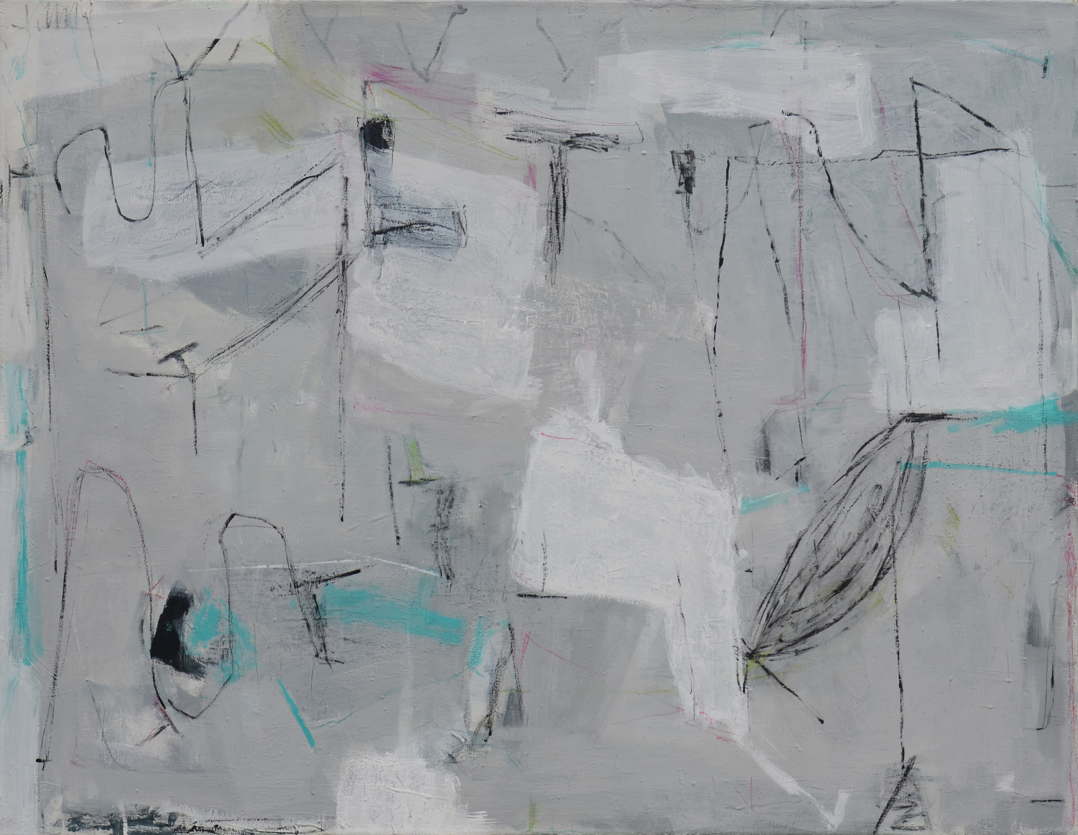 …Sie begibt sich auf eine gleichsam archäologische Spurensuche nach dem Gewesenen, bei der benachbarte Assoziationen hinzutreten und die langsam wachsende Bildgestalt mehrfach verändern. Diesem ergebnisoffenen Arbeiten entspricht in den Bildern ein geschichteter Aufbau von locker strukturierten Flächen, die einander überlagern, sich wechselweise verdecken und freilegen – manchmal mit unvermittelt heftigem Gestus, als reiße etwas auf und bringe das ansonsten stabile Gefüge der Bilder ins Wanken. Ihr orthogonales Grundraster schafft Festigkeit, dabei ist die Malerei leicht, ja transparent. Ein immaterieller Raum wird suggeriert, wo Figur und Landschaft als Anlage in der Schwebe bleiben: in der Gestalt der großen, fast monumentalen Farbformen und der durch sie hindurch verlaufenden Konturen einer schemenhaften Figürlichkeit, die im offenen Bildraum verlischt, nicht ohne sich als Spur im Sinne eines Fadens, der der Wiederaufnahme harrt, auch weiterhin zu erkennen zu geben.