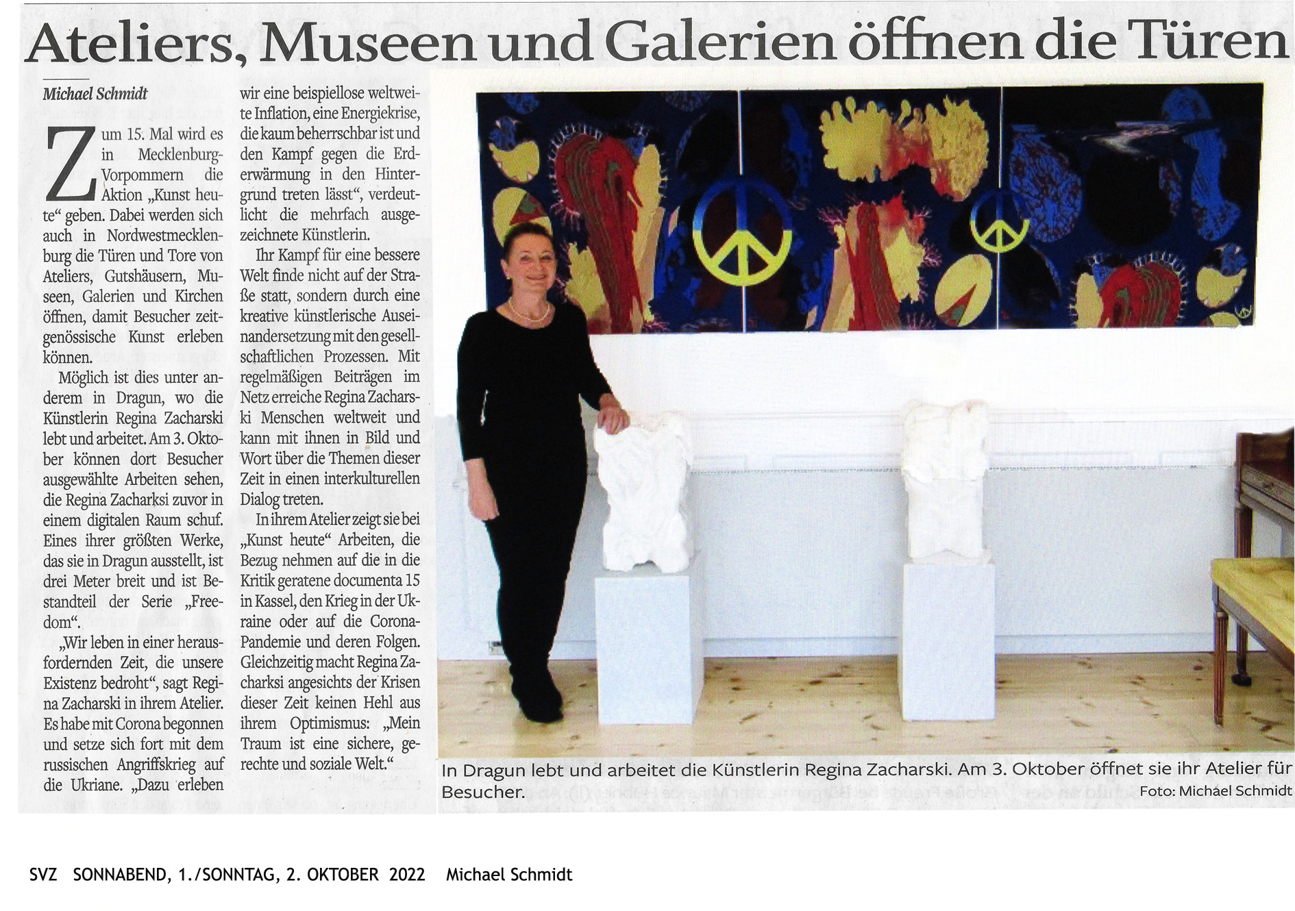 K U N S T H E U T E https://www.kunstheute-mv.de/nachrichtenleser/06-2019.html Atelier Regina Zacharski 3. Oktober, von 14 bis 18 Uhr