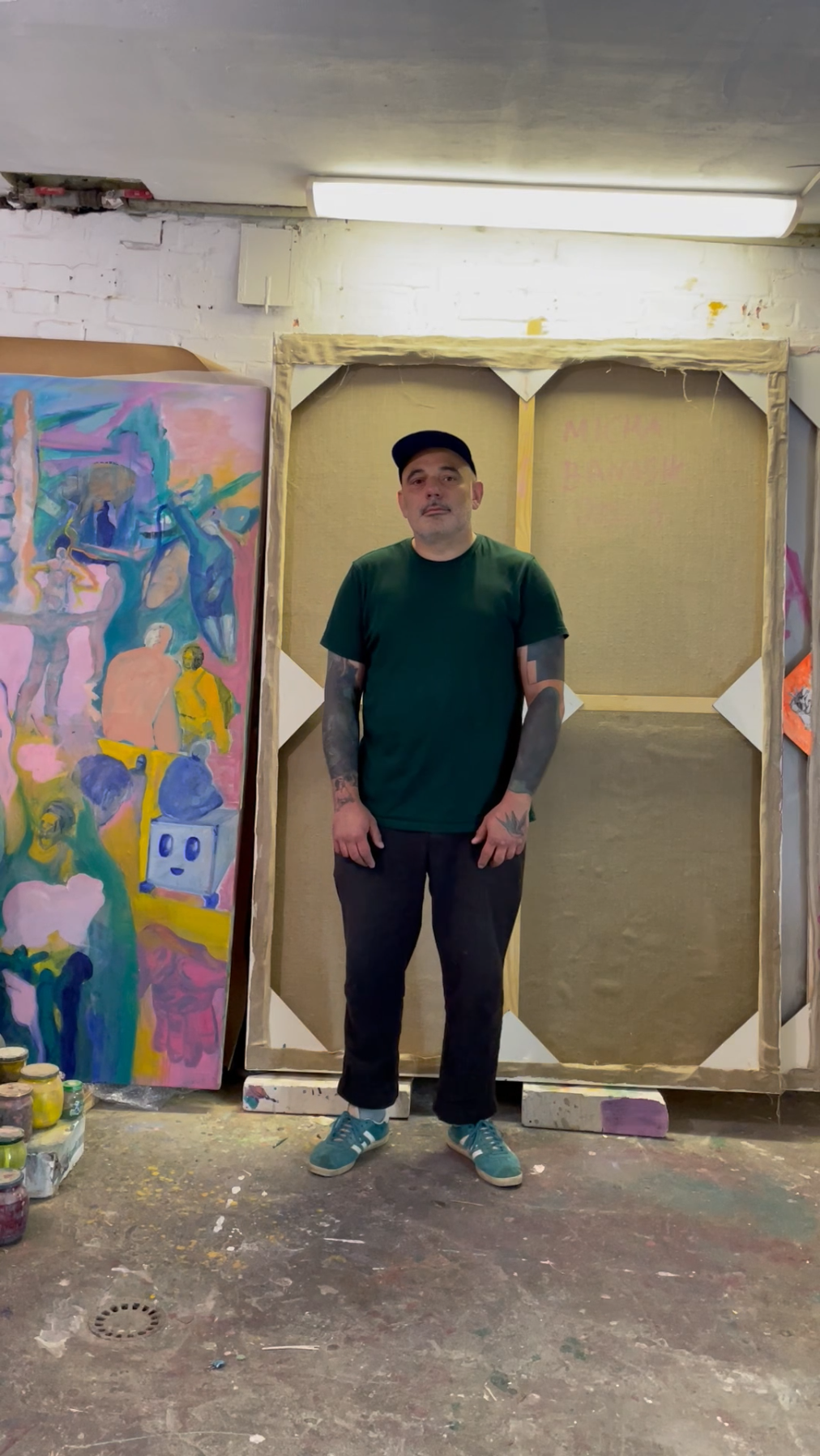 DER BESUCHER, 2024. Verschiedene Medien: Außenteil – Öl auf Leinwand; Innenteil – Acryl, Öl und Marker auf Papier, Gesamtmaße: 45 x 45 cm. -