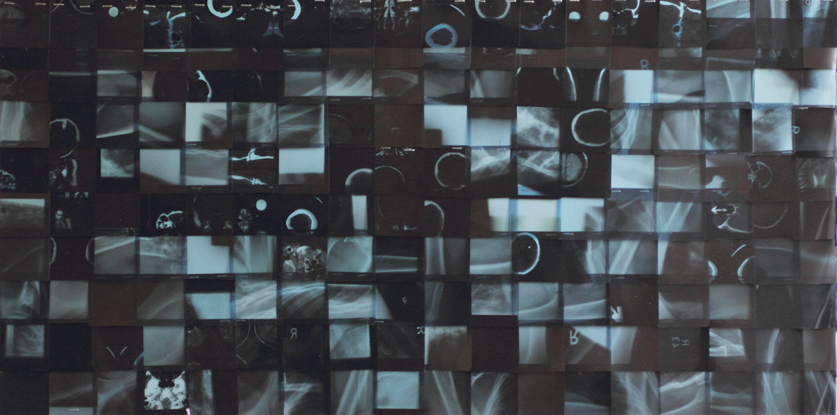 Einsichten, Röntgenbildfragmente auf Leinwand, Holz, Objekt, 2016
