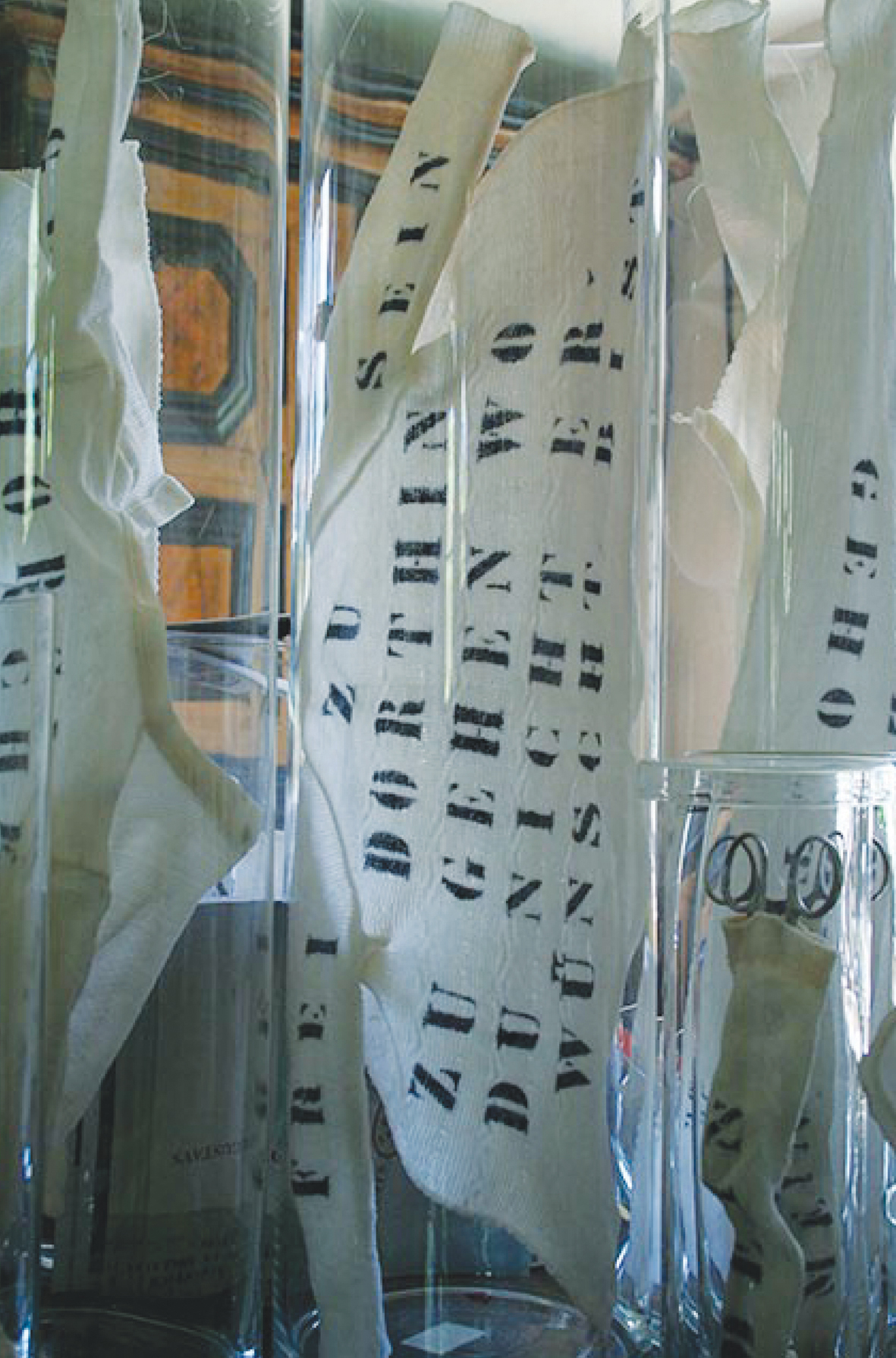 2018 Mestlin Kunstlandschaft „Idealfall“, Gläser mit Text auf Textil WAS IST WENN WIR UNS IRREN
