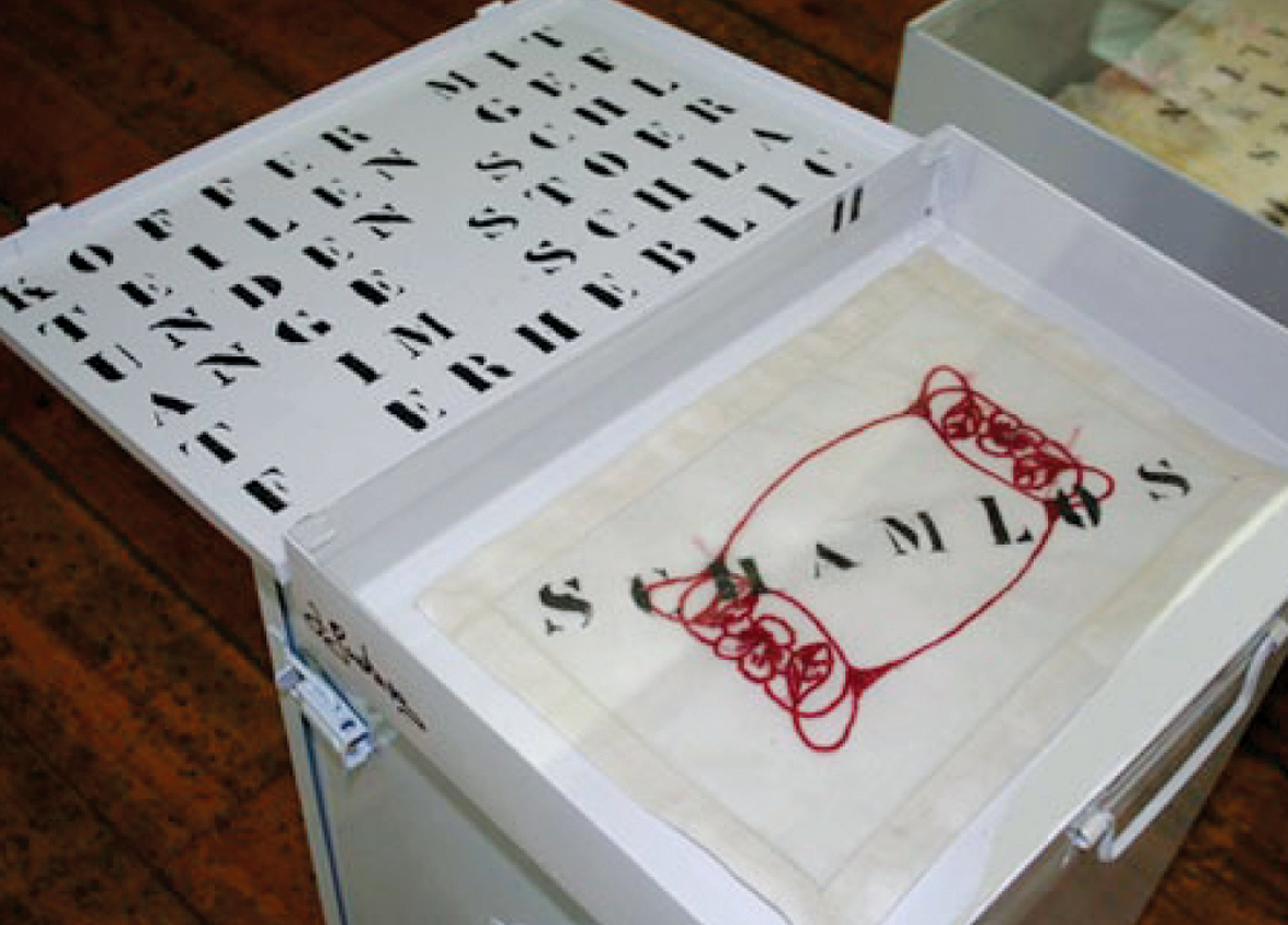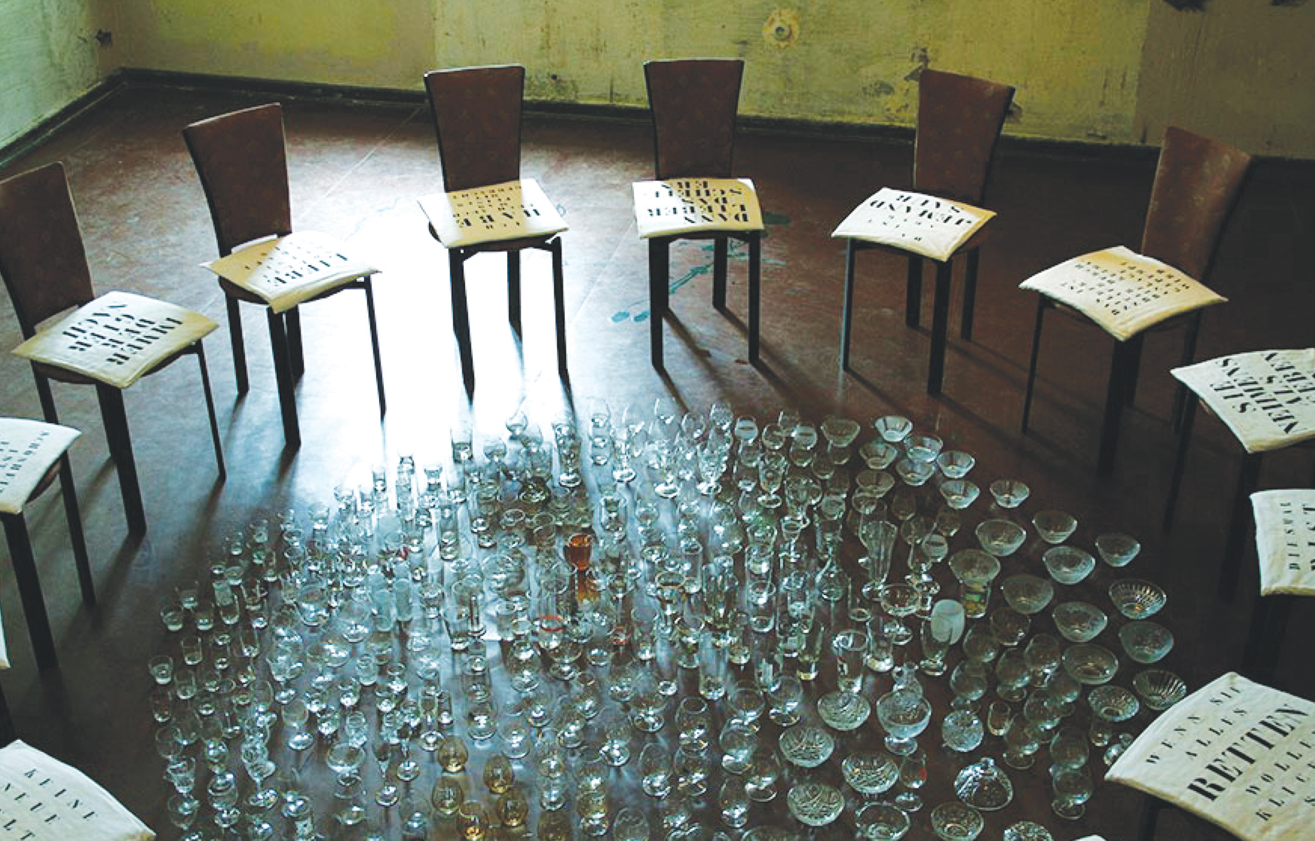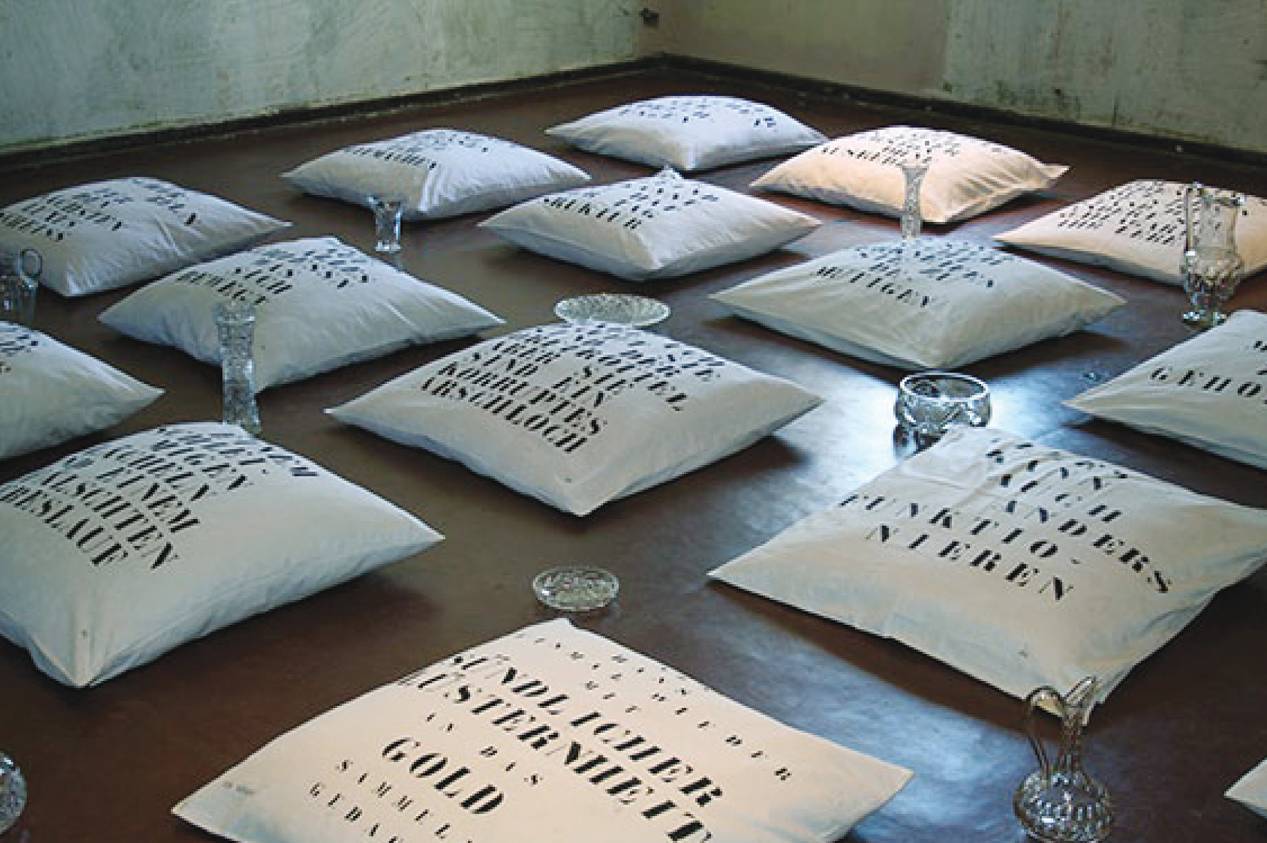Zwecke der Einmischung in gesellschaftliche Diskurse. Die Installationen arbeitet mit der Hinzuziehung anderer Kunstformen wie der Literatur, in der die Zeichen zu Bildern werden.