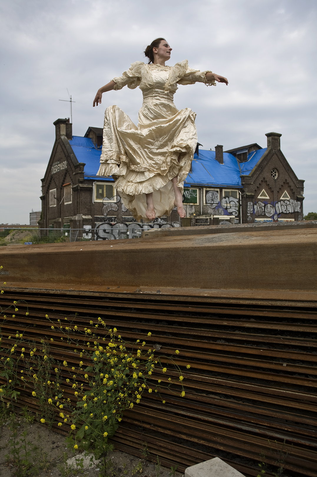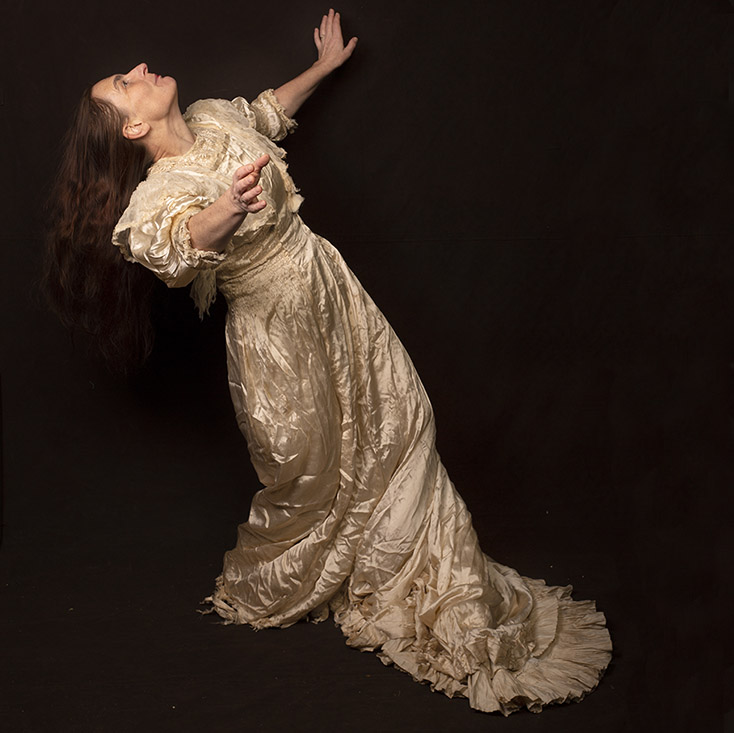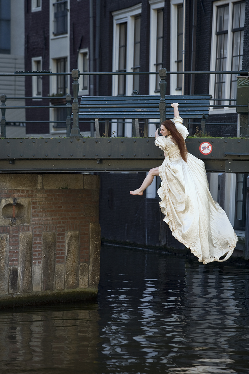 Im seidenen Brautkleid meiner Ururgroßmutter Elisabeth Schnorr von Carolsfeld reise ich an Orte, die mit ihr, mit dem Kleid und mit mir zu tun haben. Sie heiratete 1880 in Leipzig-Paunsdorf. Der Spitzenbesatz stammt wahrscheinlich doch nicht aus Venedig. Aber ich kann am Geländer der Herengracht in Amsterdam mit der lang hängenden Schleppe Staat machen...