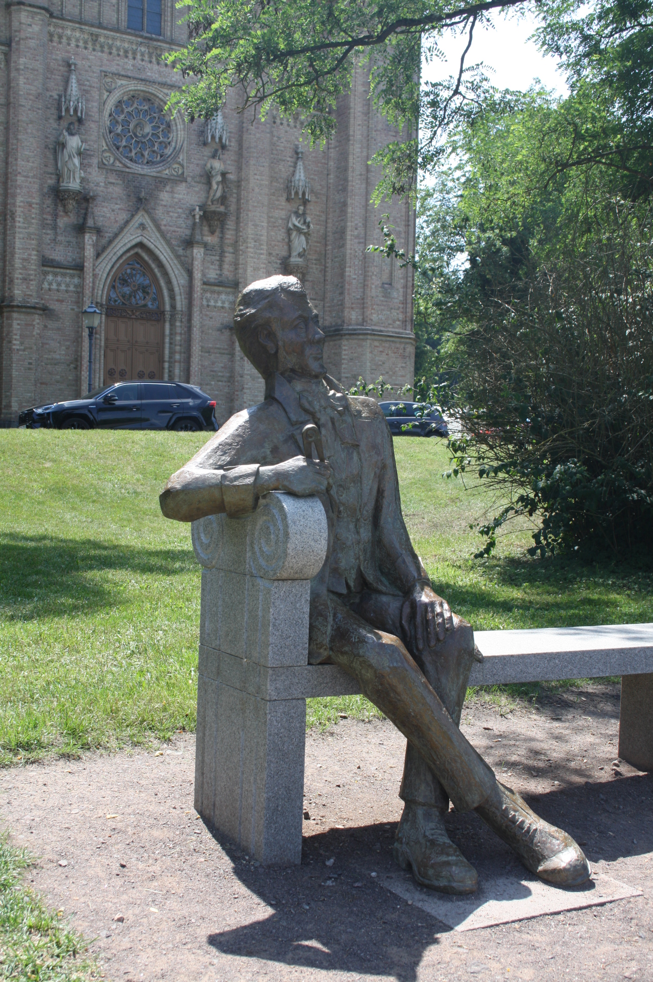 „Friedrich Wilhelm Buttel“ (1796 – 1869) Denkmal-Bank für den Hofbaumeister von Mecklenburg-Strelitz Bronzeguss / Granit, H. 1,40 m / B. 1,90 m / T. 0,80 m vor der Schlosskirche, Neustrelitz (2023)