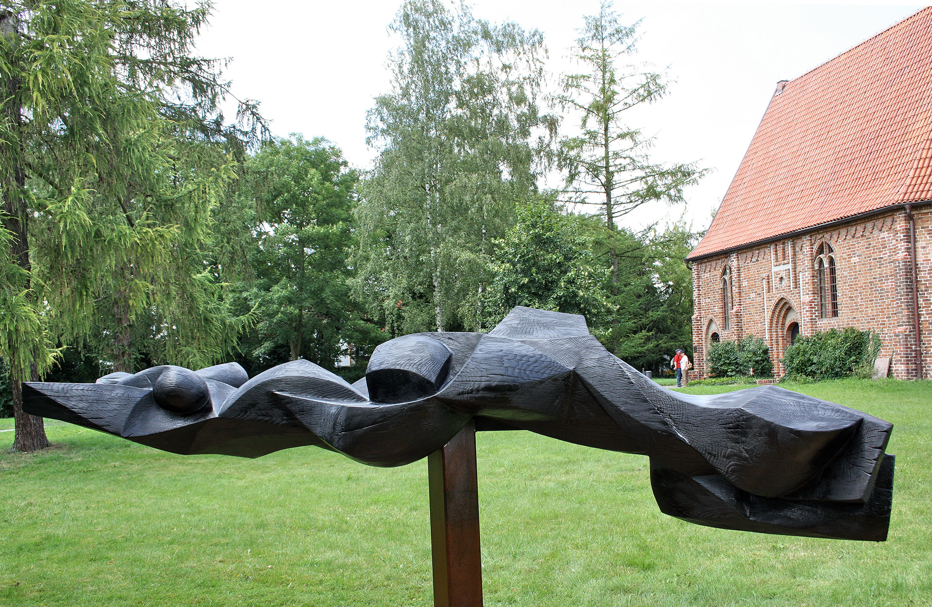 „Großes Fließen“ Eiche gebrannt, auf Stahlsäule, H. 1,50 m / B. 3,20 m , Güstrow (2009) -