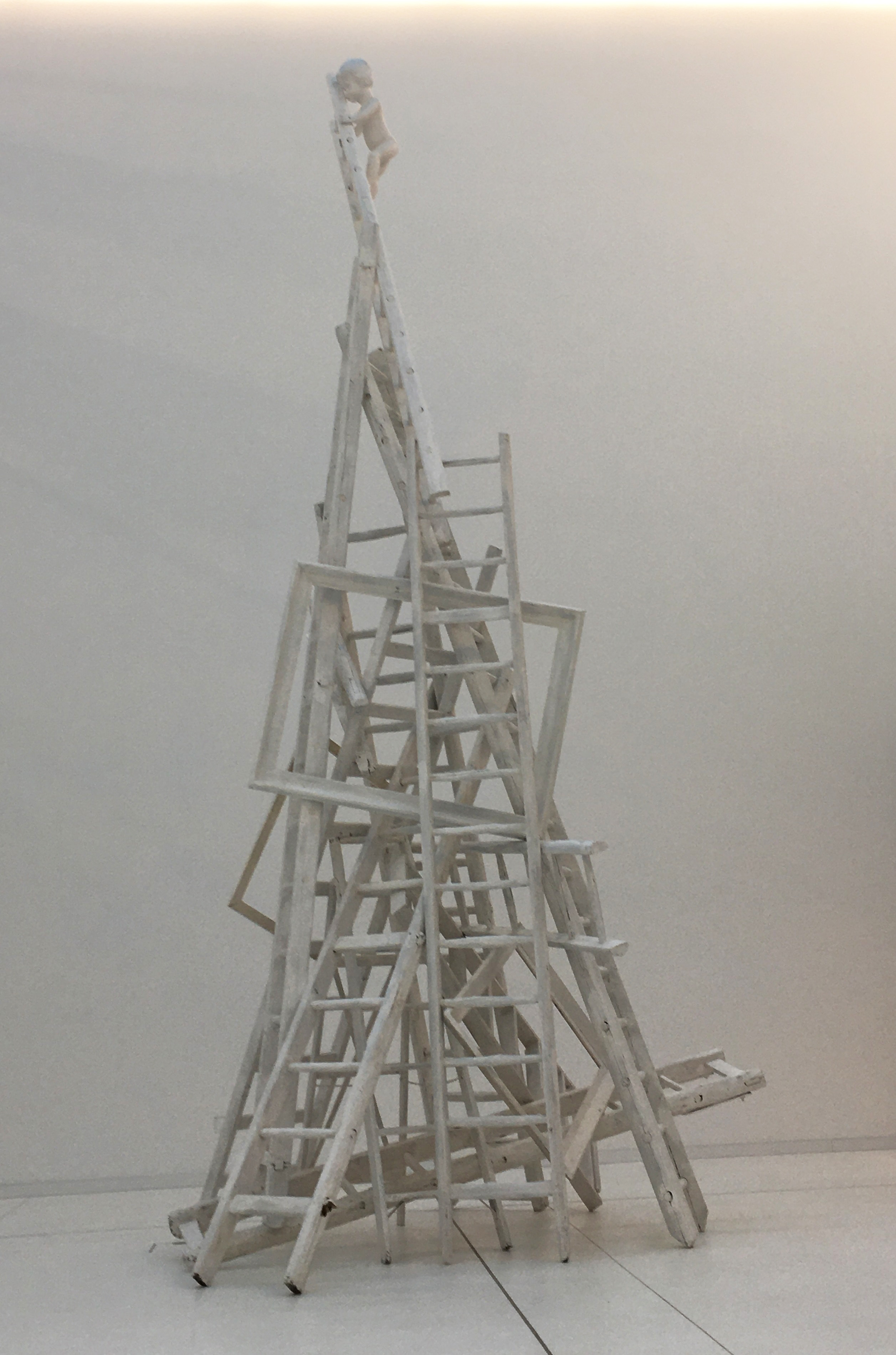 "Wo ist das Licht der Vernunft" Holzleitern, Bilderrahmen und Spielzeug-Puppe, geweißt, H: 5,0 m / B: 2,0 m / T: 2,5 m, 2024